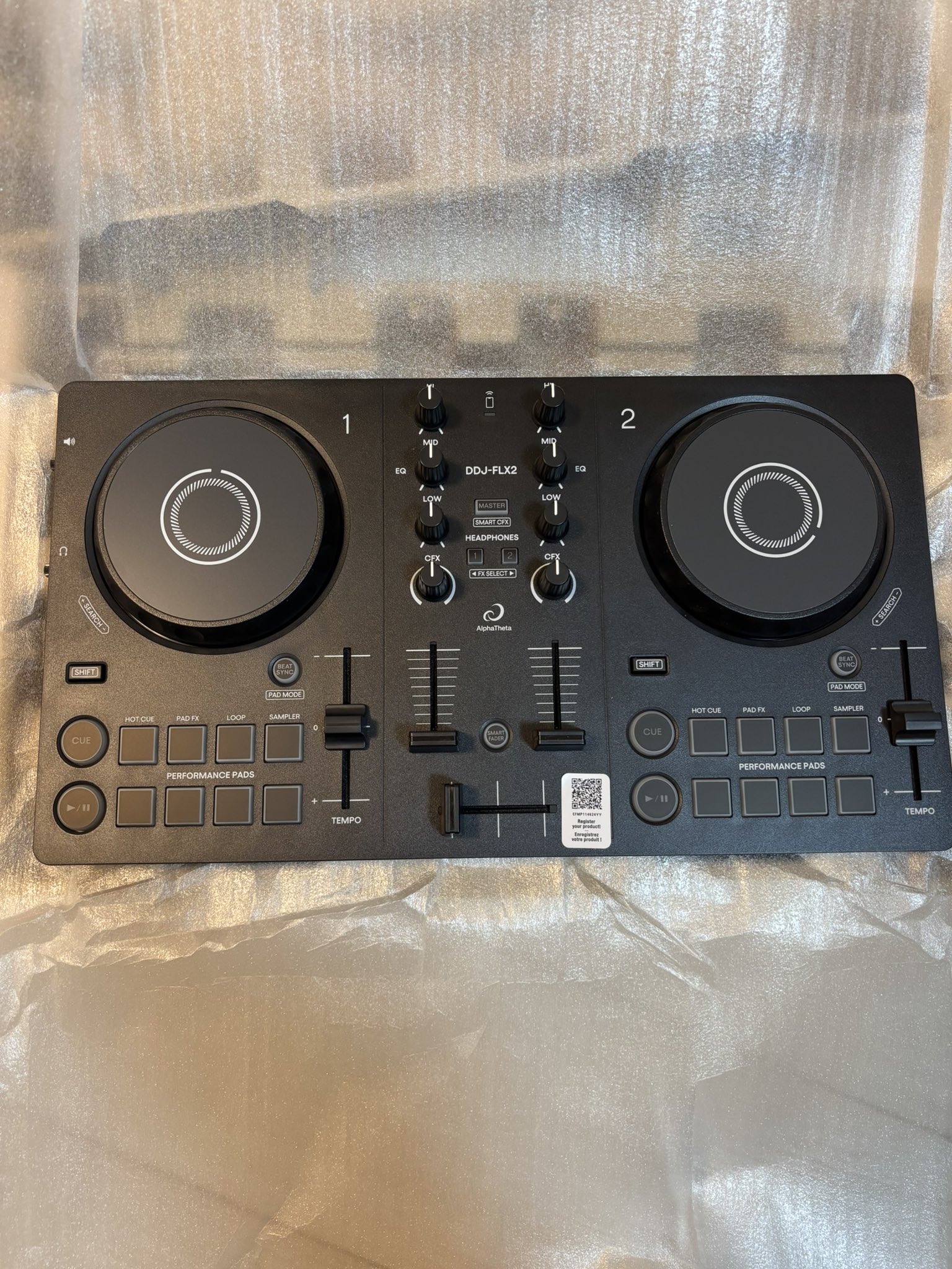 機種はAlphaThetaのエントリーモデルのDDJ-FLX2。税込で27,500円だった。エントリーに数十万くらいかかるのでは、と思っていたが店員さんに話を聞いてこの機種を買って試してみることにした。